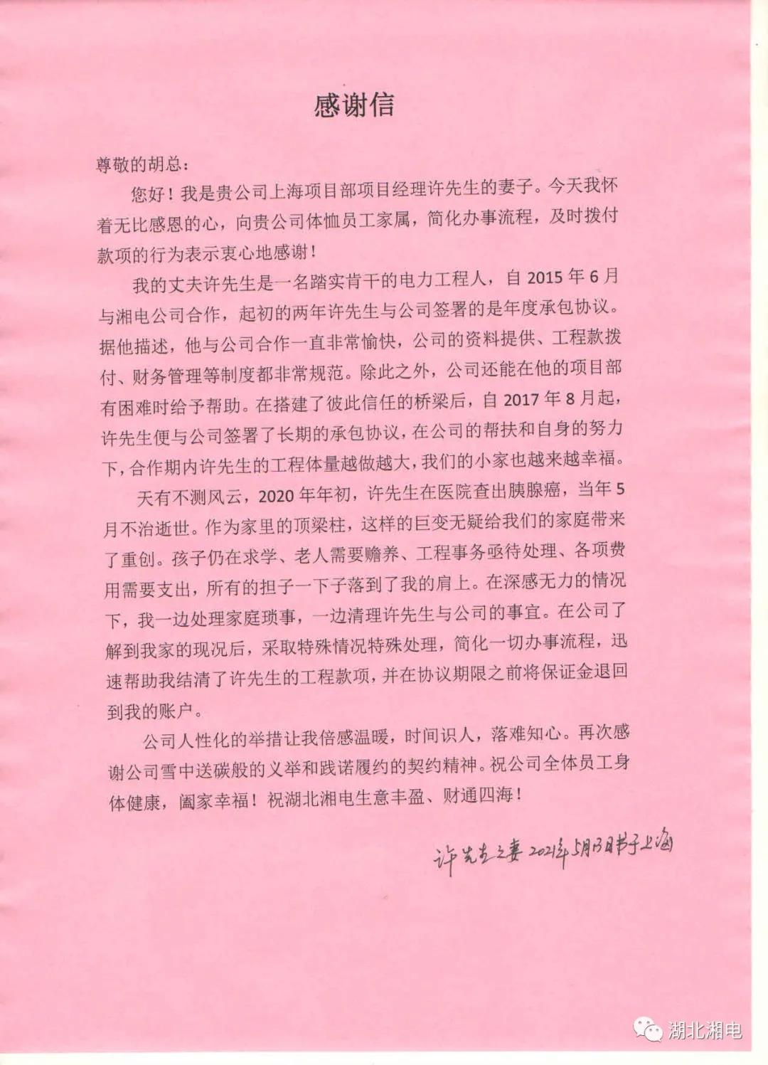 公司人性化的举措让我倍感温暖,时间识人,落难知心。再次感谢公司雪中送碳般的义举和践诺履约的契约精神。祝公司全体员工身体健康,阖家幸福!祝湖北湘电生意丰盈、财通四海!