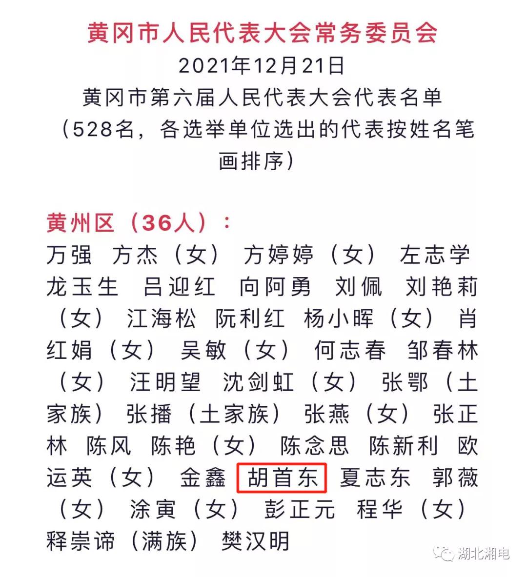 2021年12月21日,在黄冈市第五届人民代表大会常务委员会第四十一次会议上,湖北湘电建设工程有限公司董事长胡首东当选黄冈市第六届人大代表。
