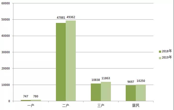 2019年,各产业用电量稳步增长。分产业看,第一产业用电量780亿千瓦时,同比增长4.5%;第二产业用电量49362亿千瓦时,同比增长3.1%,其中,工业用电量48473亿千瓦时,同比增长2.9%;第三产业用电量11863亿千瓦时,同比增长9.5%;城乡居民生活用电量10250亿千瓦时,同比增长5.7%。