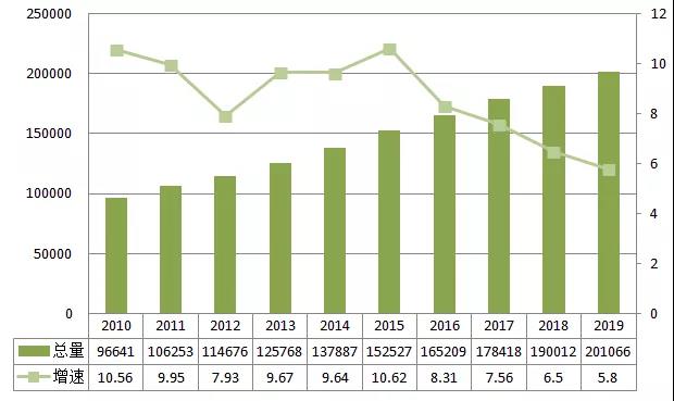 图1  2010~2019年全国全社会用电量及增速情况(单位:亿千瓦时,%)