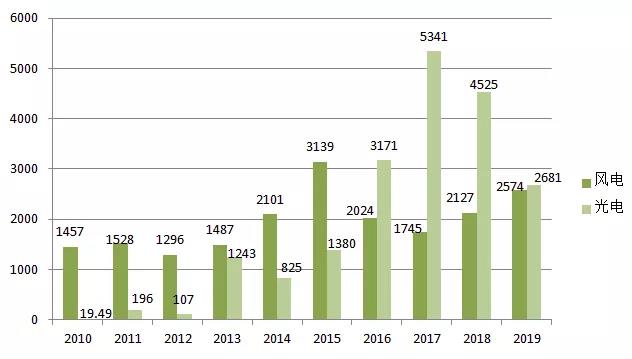 图16  2010~2019年风光发电新增装机情况(单位:万千瓦)