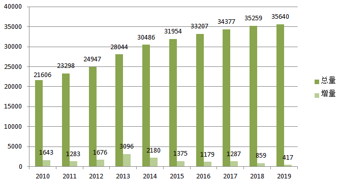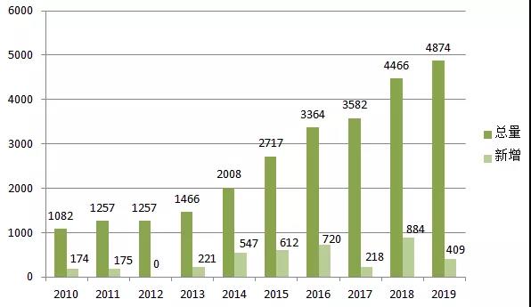图8  2010~2019年全国新增电力装机容量情况(单位:万千瓦)