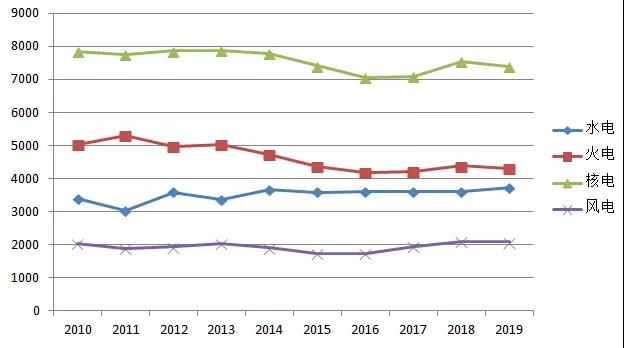图21  2010~2019年不同电源发电设备利用小时变动情况