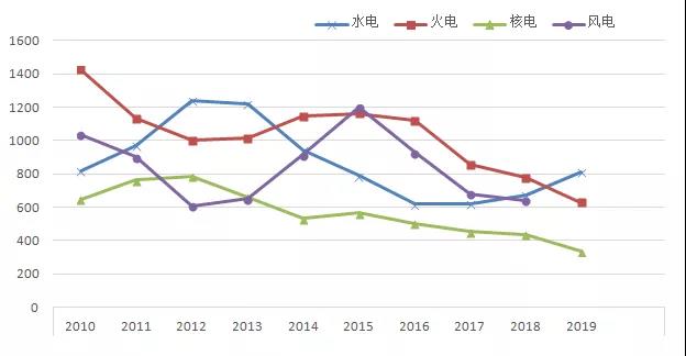 图28   2010~2019年水电、火电、核电、风电投资情况(单位:亿元)