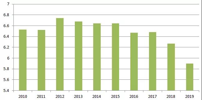 从装机增速看,自2015年之后,我国装机增速呈下降趋势。继2018年创出6.5%的十年新低之后,2019年再度“下探”——电力装机增速仅达到5.8%,低于GDP6.1%的增速,高于全社会用电增速1.3个百分点。