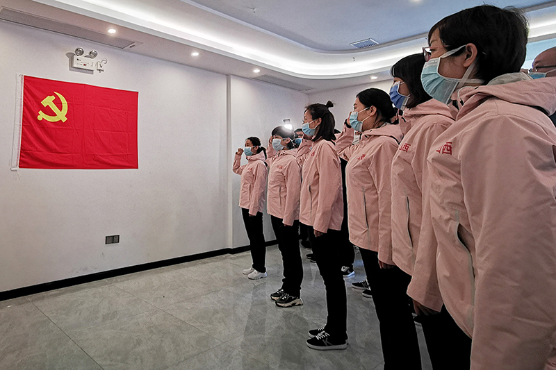 2020年2月9日,在山东济南,山东大学第二医院支援湖北抗疫国家医疗队中的党员在出发前重温入党誓词。新华社记者 朱峥 摄