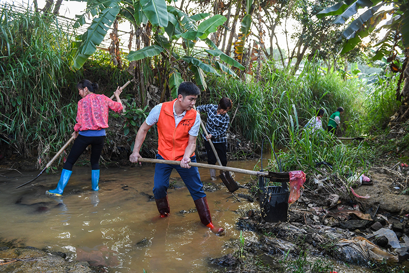 2020年5月2日,广西兴业县小平山镇金华村驻村第一书记董积有(左二)与村民一起清理河道中的淤泥和垃圾。新华社记者 曹祎铭 摄