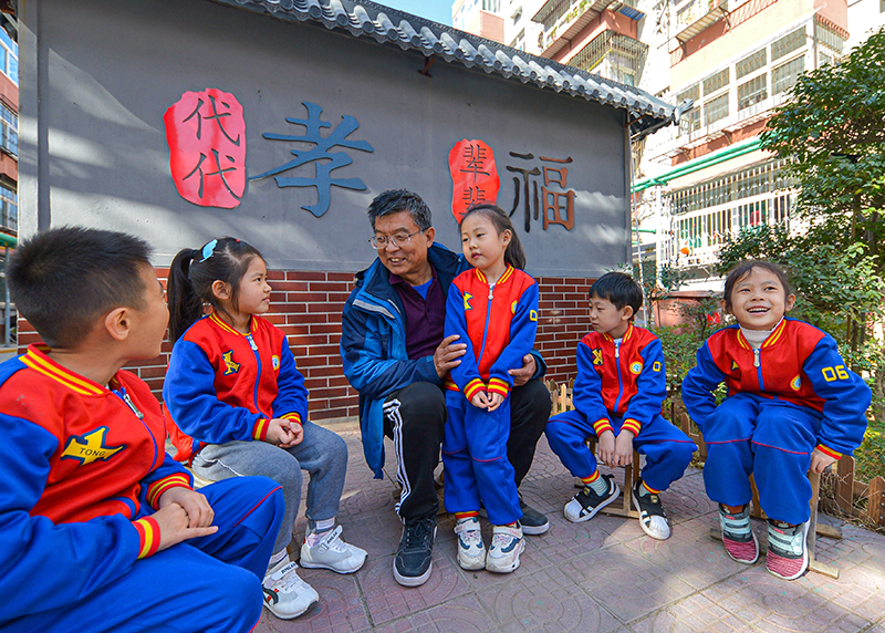 2020年11月2日,在河北邯郸市邯山区中华南四号小区,宣讲员在向孩子们讲家风家训故事。新华社记者 王晓 摄