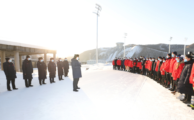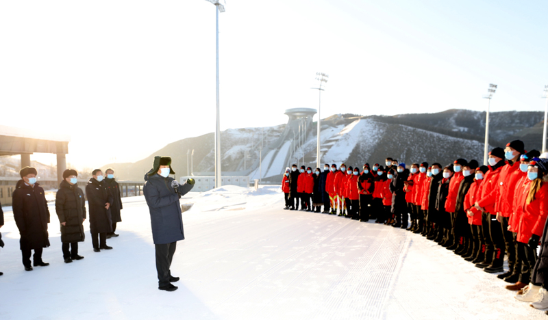 在国家冬季两项中心看台,习近平观看了冬季两项越野滑雪和射击运动员接力训练情况,并看望慰问国家冬季两项、跳台滑雪队运动员、教练员和张家口赛区运行保障团队、建设者代表。习近平亲切地对大家说,我这次来考察北京冬奥会、冬残奥会筹办情况,也是在牛年春节前来看望大家。大家都在为办好一届成功的冬奥盛会而努力,运动员在刻苦训练,建设单位和建设者、保障团队兢兢业业,成功打造了一批世界一流的精品工程,大家的奋斗精神、奉献精神令人感奋。习近平强调,北京冬奥会、冬残奥会所有场馆建设提前一年完成,我国很多冰雪项目在两年多时间里实现从无到有,有的项目达到了世界先进水平,充分体现了党的领导和举国体制、集中力量办大事的制度优势。