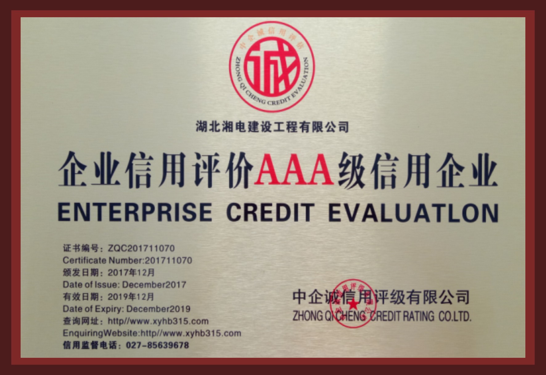 企业信用评价AAA级信用企业