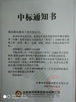我公司“湖北湘电建设工程有限公司”于2017年8月21日经安徽省招标集团股份有限公司评标委员会评定为“中粮生物化学(安徽)股份有限公司改造项目(热电厂)110kv接入系统工程(供货、施工、安装、试验、调试)总承包”项目的中标单位。