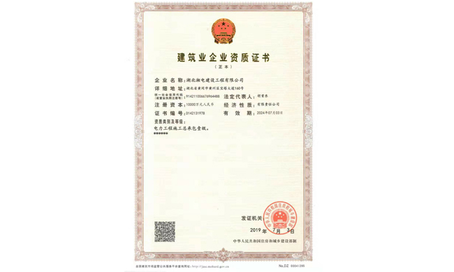 2019年7月9日,住房和城乡建设部发出《关于核准2019年度第六批建设工程企业资质名单的公告》,公告名单显示湖北湘电电力工程施工总承包壹级资质正式获住建部审批通过,并于7月15日顺利取得资质证书,这也是湖北省首家民营企业获得的此类资质证书。公司由此可承担各类发电工程、各种电压等级送电线路和变电站工程的施工。此次资质的成功取得是公司取得的又一丰硕成果,也是本年度工作的再次重大突破。