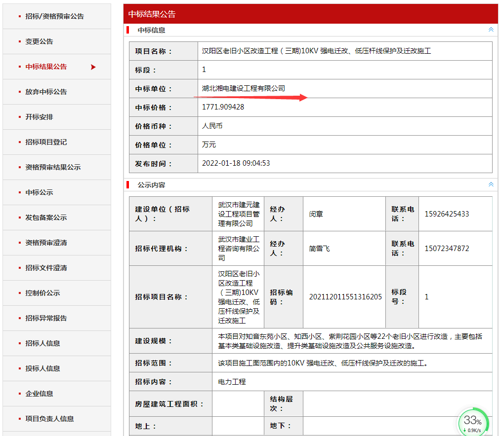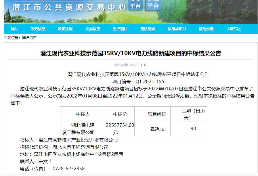 本月湖北湘电建设工程有限公司连续中标由潜江市高新技术产业投资开发有限公司招投标的“潜江现代农业科技示范园35KV/10KV电力线路新建项目”、由武汉市建元建设工程项目管理有限公司招投标“汉阳区老旧小区改造工程(三期)”中标金额分别为2255.7754万元和1802.752485万元。