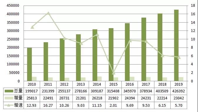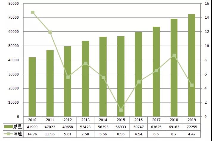 图1  2010~2019年全国全社会用电量及增速情况(单位:亿千瓦时,%)