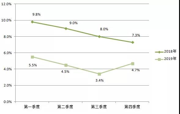 2019年,各季度全社会用电量增速分别为5.5%、4.5%、3.4%和4.7%。通过对比可以看出,2019年每个季度增速均低于2018年同期水平。