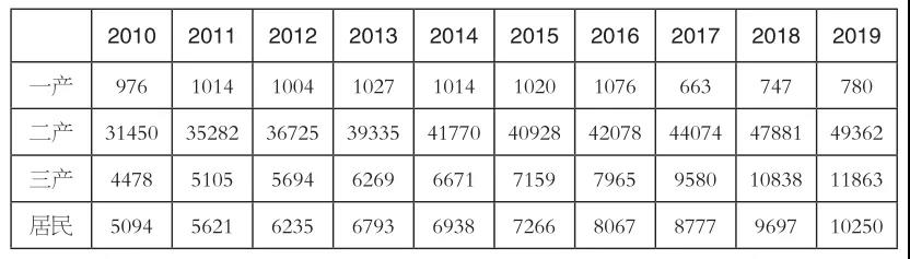 表1   2010~2019年分产业用电量(单位:亿千瓦时)