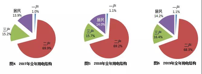 2019年,三个产业和城乡居民生活用电增速分别降低5.3、4.1、3.2、4.7个百分点。第二产业中四大高载能行业用电量比上年增长2.0%,其中,建材行业用电量增速为5.3%,黑色行业用电量增速为4.5%,化工行业用电量与上年持平,有色行业用电量降低0.5%;高技术及装备制造业、消费品制造业、其他制造业用电量增速相对平稳,用电量分别比上年增长4.2%、2.2%、6.3%。第三产业中的信息传输/软件和信息技术服务业、租赁和商务服务业、房地产业、批发和零售业、交通运输/仓储和邮政业用电量实现快速增长,用电量增速均在10%以上。