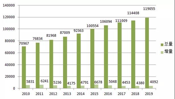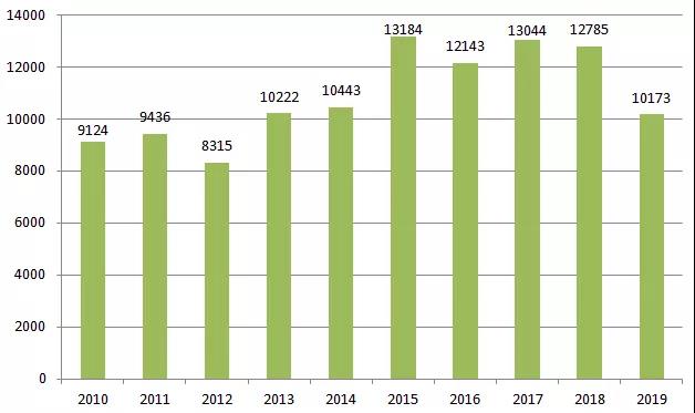 图8  2010~2019年全国新增电力装机容量情况(单位:万千瓦)