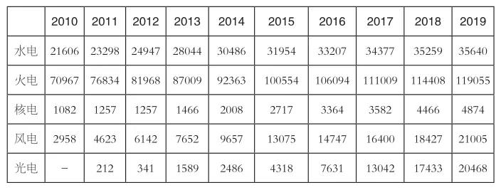表2   2010~2019年全国电力装机结构(单位:万千瓦)