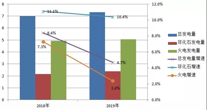 图9   2018~2019年全国发电量及增速情况(单位:万亿千瓦时,%)