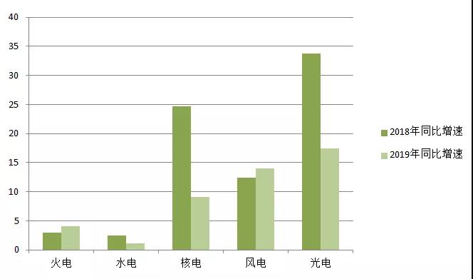 从装机增速看,2019年,火电装机同比增长4.1%,较2018年高出1.1个百分点。风电装机同比增长14%,较2018年增速高出1.6个百分点。光伏发电、核电装机虽仍以17.4%、9.1%的速度增长,但较上一年增速大幅下降,分别减少16.3、15.6个百分点。水电装机同比增长1.1%,较2018年降低1.4个百分点。