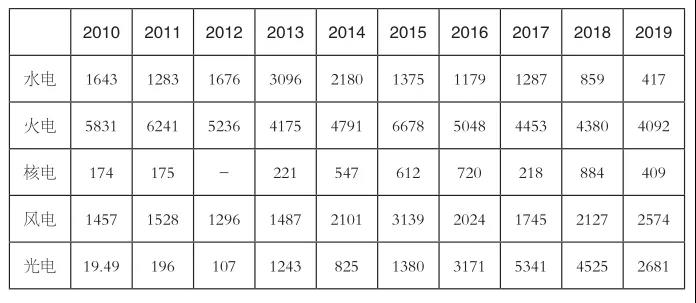 表3   2010~2019年各类发电新增装机情况(单位:万千瓦)