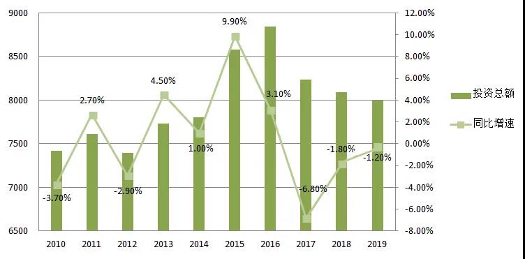 图25  2010~2019年全国电力投资总量及增速情况(单位:亿元,%)