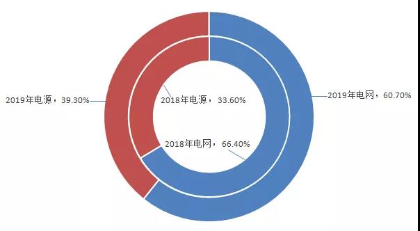 2019年全国电源基本建设投资占电力投资的比重为39.3%,较上一年增加5.7个百分点;电网基本建设投资占电力投资的比重为60.7%,较上一年降低5.7个百分点。近十年来,网源投资结构出现较大变化。在“十二五”前三年,电网投资略低于电源投资,占比基本相当;自2014年起,电网投资持续超过电源投资,并在2018年超过电源投资近1倍,达到历史峰值,2019年二者的差距略有缩小。