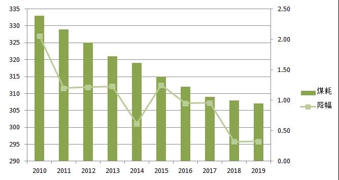 图29  2010~2019年供电煤耗和降幅(单位:克/千瓦时,%)