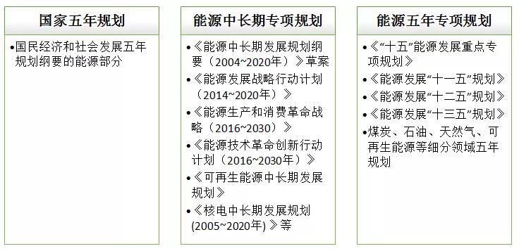 国民经济和社会发展五年规划纲要中的能源部分,主要阐明国家能源战略方向,包括五年间的能源发展总目标以及重大建设项目等,为能源专项规划的制定提供了重要遵循。能源中长期专项规划一般规划较为长期的能源发展方向,可再生能源、核电等中长期专项规划是细分领域更为长期的发展战略,设定行业健康发展的远景目标。能源五年规划根据国民经济与社会发展五年规划纲要制定,是对未来五年内能源发展的规模与重点项目进行设计。能源五年规划及其细分领域五年规划同一时间段基本目标一致。
