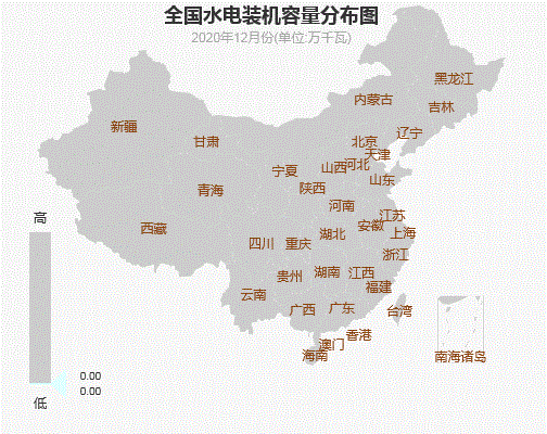 2020年,全国全口径水电装机容量达37016万千瓦(含抽水蓄能3149万千瓦),同比增长3.4%,占全部装机容量的16.82%。全国水电装机容量分布图如下所示。