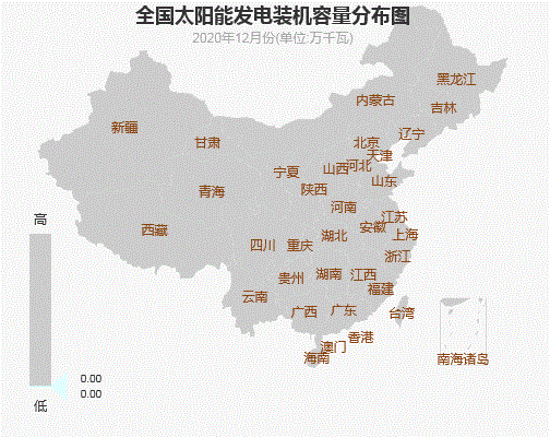 2020年,全国并网太阳能发电装机容量达25343万千瓦,同比增长24.1%,占全部装机容量的11.52%。全国太阳能发电装机容量分布图如下所示。