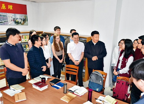 2018年5月2日,中共中央总书记、国家主席、中央军委主席习近平来到北京大学考察。这是习近平在北京大学马克思主义学院,与正在就“解读新时代”进行座谈交流的中外学生亲切交谈。新华社记者 李涛/摄